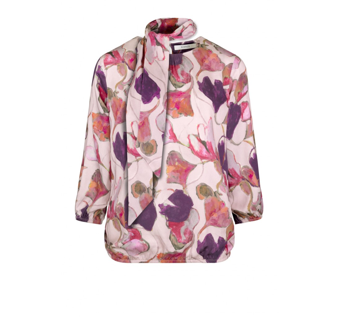 Dámská halenka s vázačkou Bianca. Barva růžová s květy. Materiál: 100% viskoza.