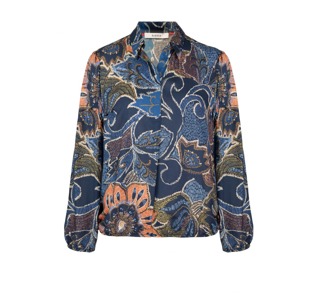 Dámská halenka Bianca na spodu do gumy. Barva modrá se vzorem. Materiál: 100% viskoza.