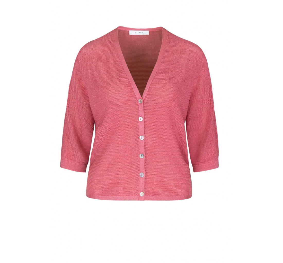 Dámský svetřík Bianca. Střih - na propínání, 3/4 rukáv. Barva růžová s lurexem. Materiál: 80% viskoza, 20% lurex.