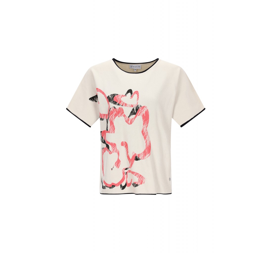 Dámská úpletová halenka Hajo. Střih rovný, krátký rukáv. Barva béžová s červeno černým potiskem. Materiál: 70% viskoza, 30% polyamid.