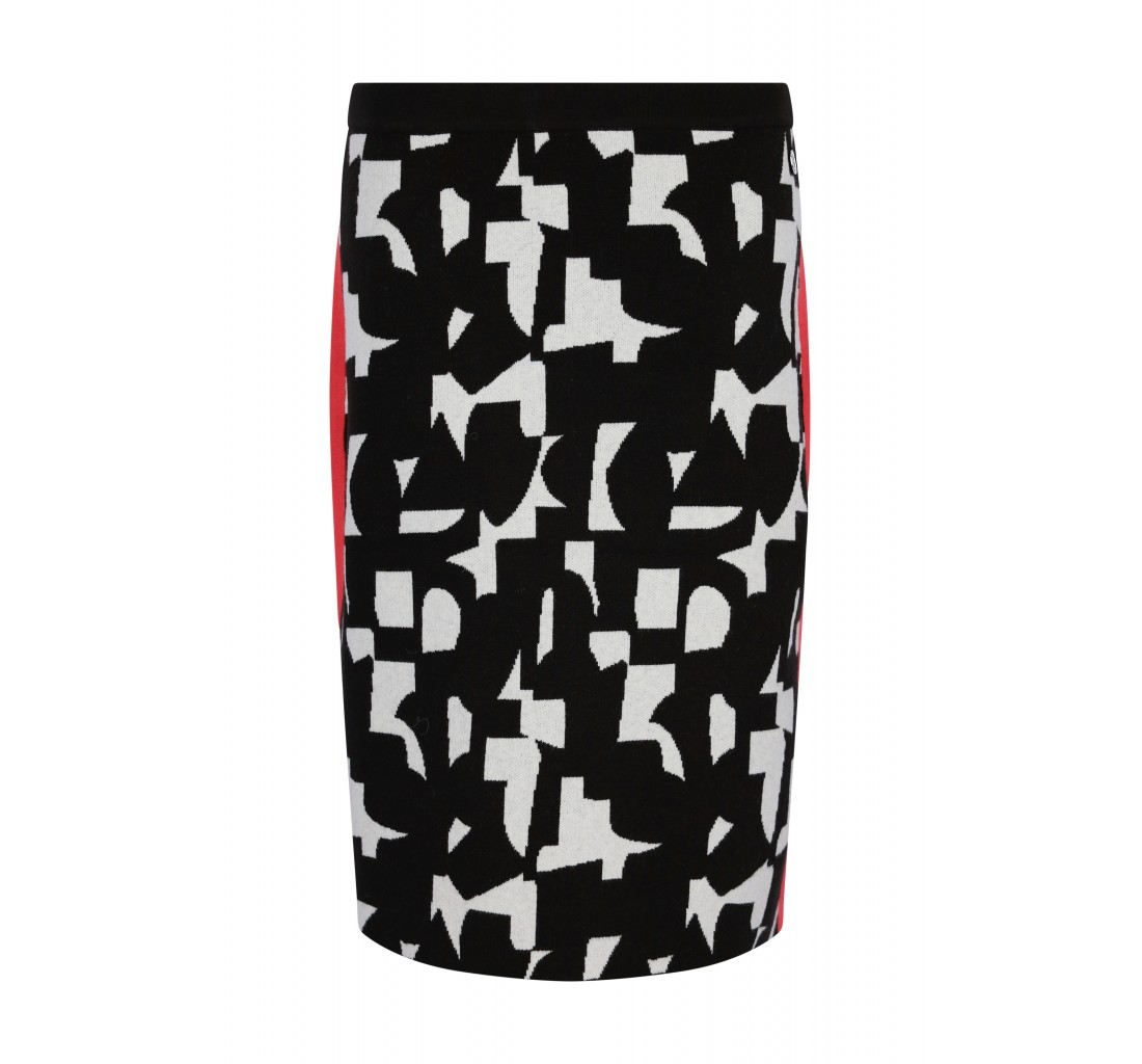 Dámská pletená sukně Hajo. Barva černo-bílá s červenými bočními pruhy. Materiál: 46% akryl, 34% polyester, 20% bavlna.