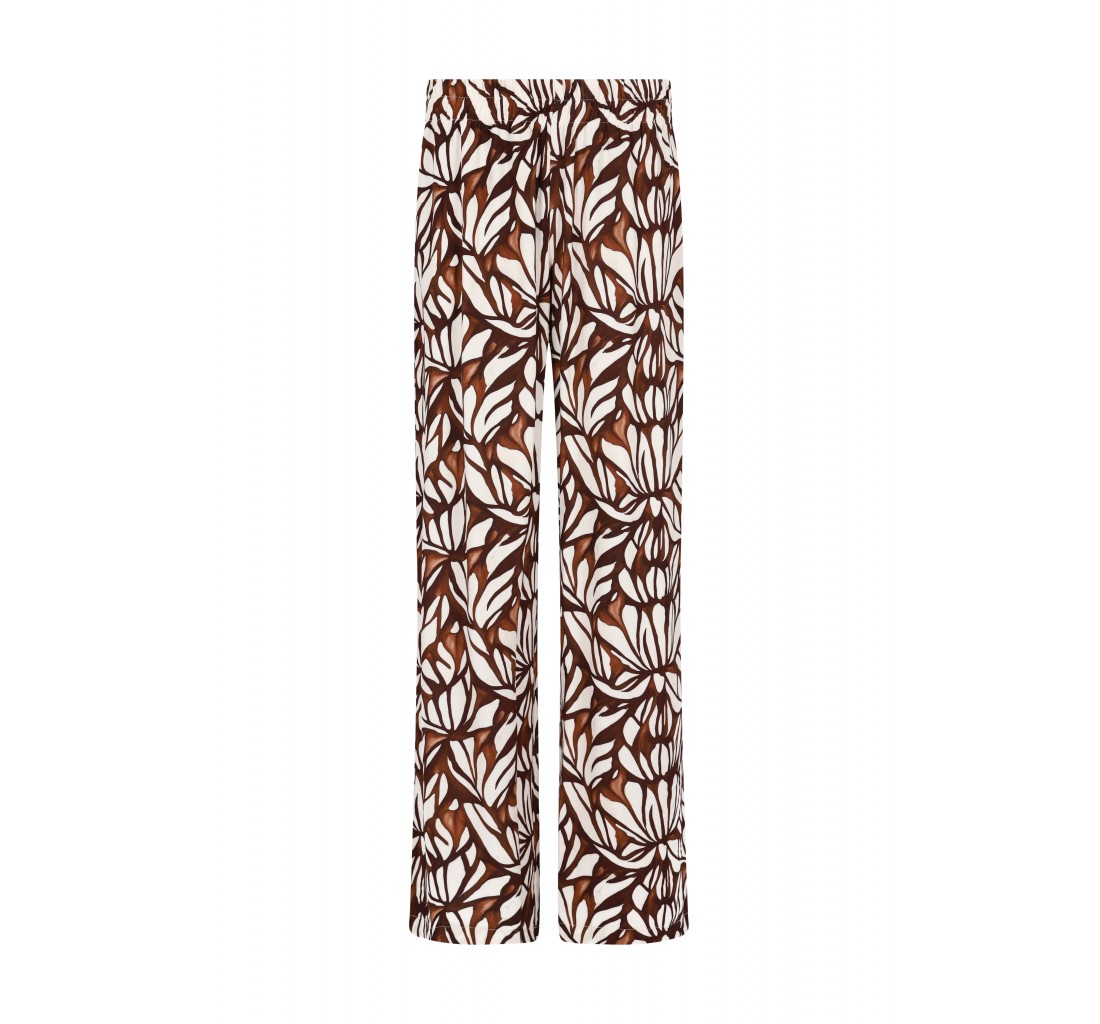 Dámské široké kalhoty Hajo. Střih do gumy. Barva: moka s bílými listy. Materiál: 100% viskoza.