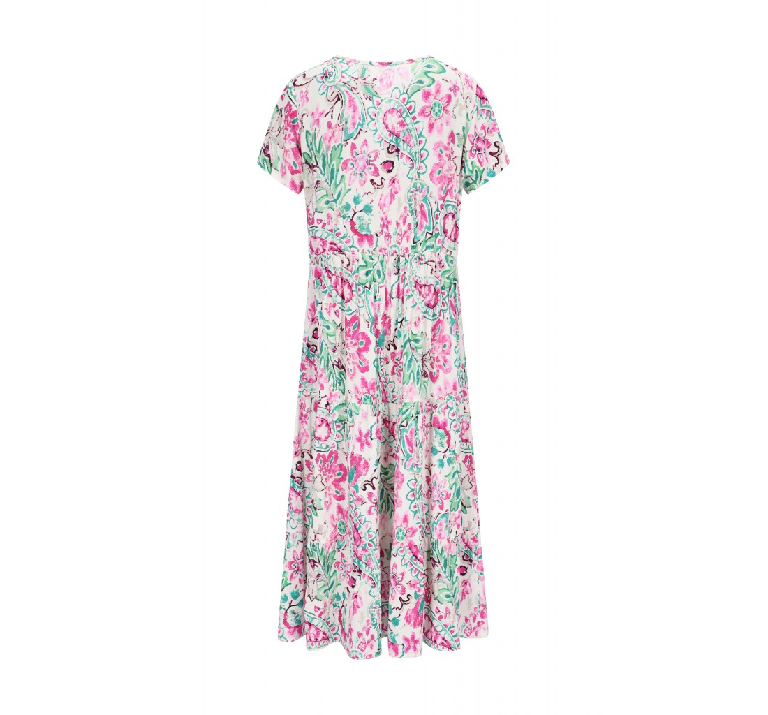 Dámské šaty Hajo. Barva smetanová s růžovo zelenými květy. Střih: řasené volány. Materiál: 100% viskoza.